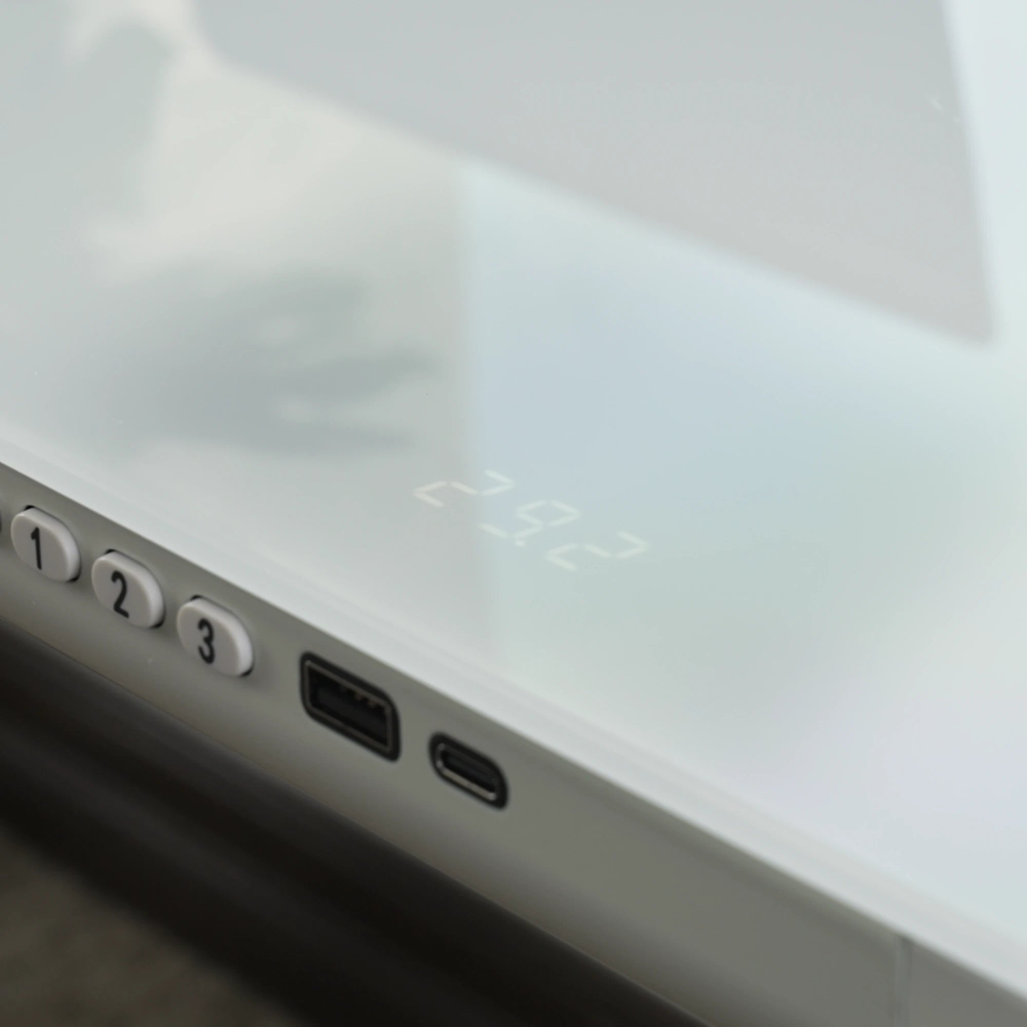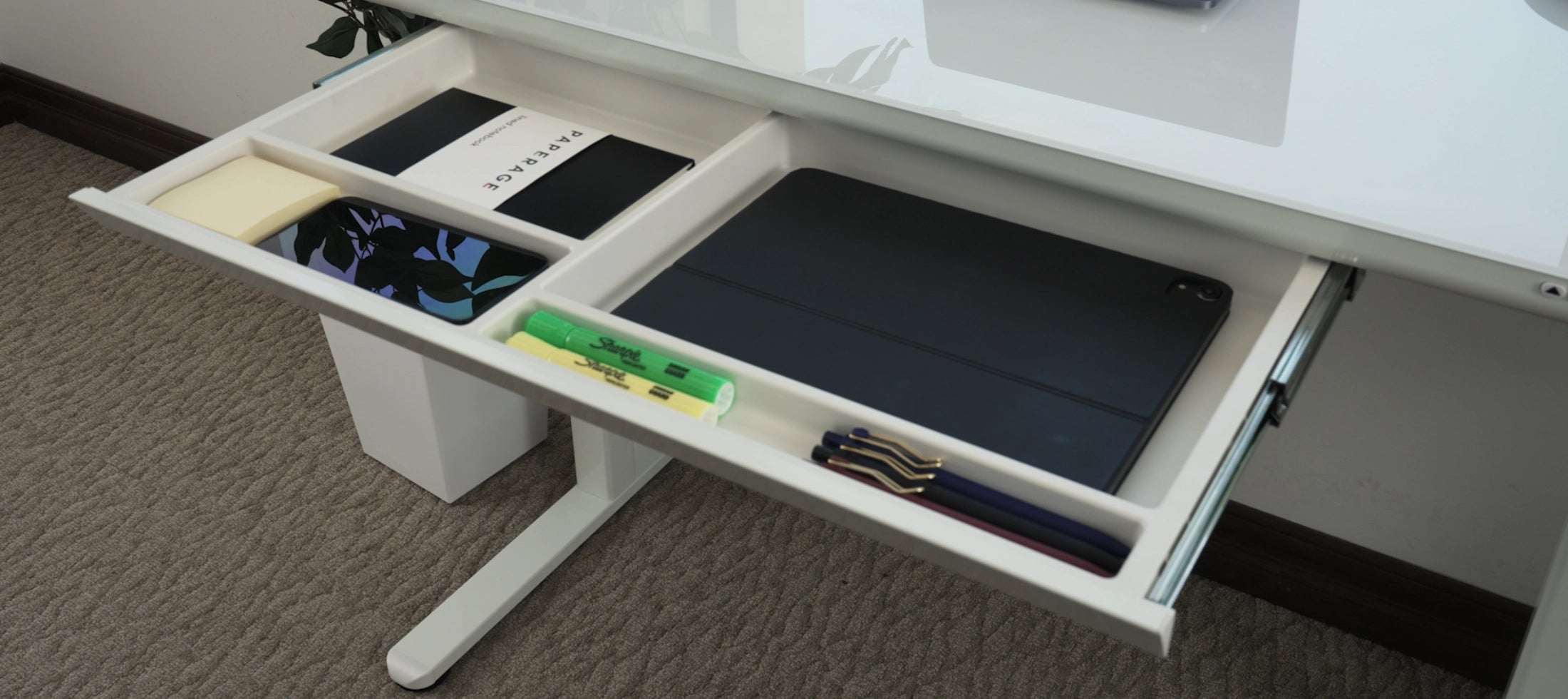 - Premium ultra-white tempered glass desktop ensures durability and easy maintenance